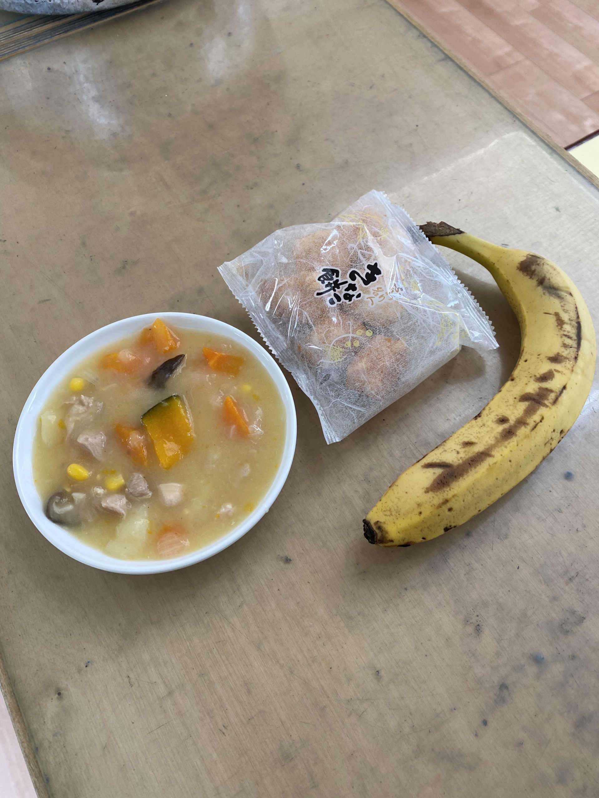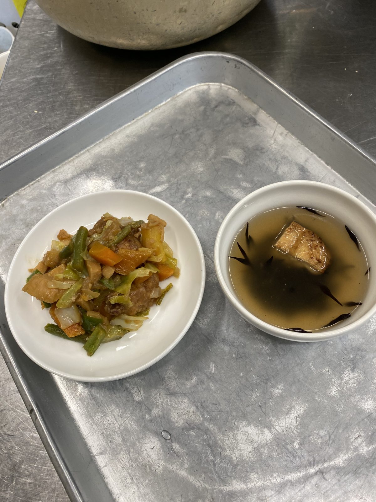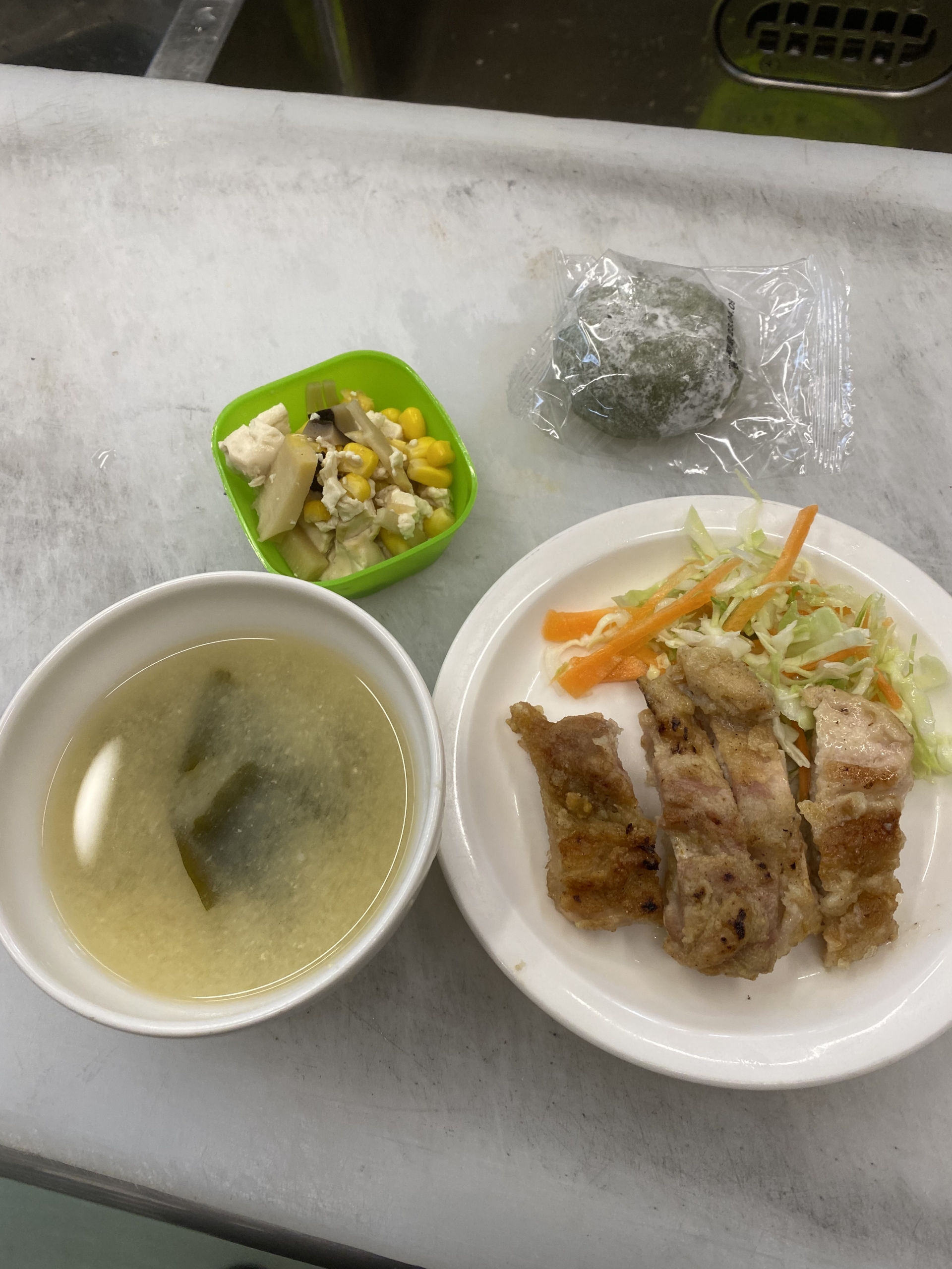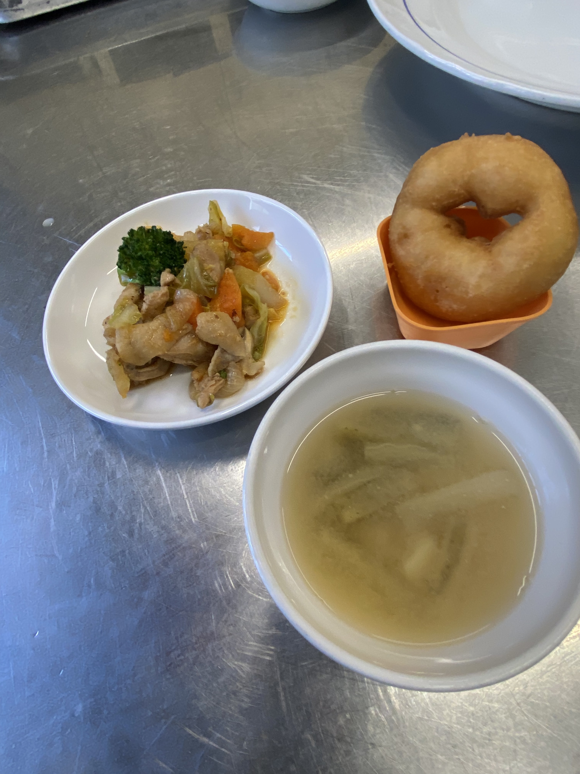 4月28日 鶏肉のパイン炒め お味噌汁 ドーナツ